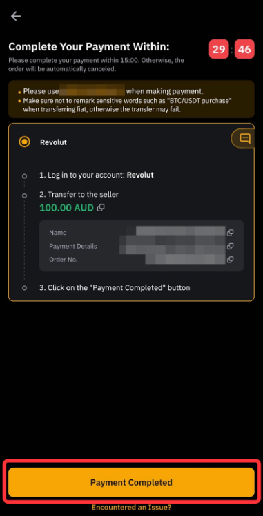— Đảm bảo không viết các từ nhạy cảm trên ID tham chiếu hoặc chi tiết thanh toán (nếu có) như “mua BTC/USDT” khi chuyển tiền fiat, nếu không, việc chuyển có thể không thành công.