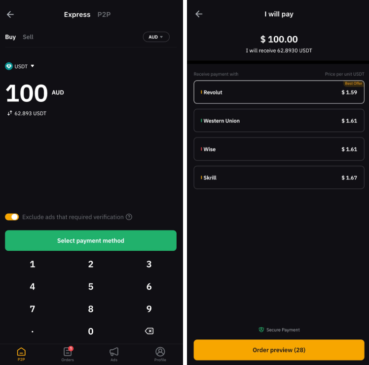 P2P Express được thiết kế để trở thành một giao dịch ngang hàng nhanh chóng và hiệu quả, cho phép các nhà giao dịch P2P mua crypto với các nhà giao dịch khác mà không cần trung gian trên Bybit App. Điều này giúp người dùng mới bắt đầu dễ dàng nhanh chóng nhận được báo giá mà không gặp rắc rối khi sắp xếp thông qua nhiều quảng cáo.