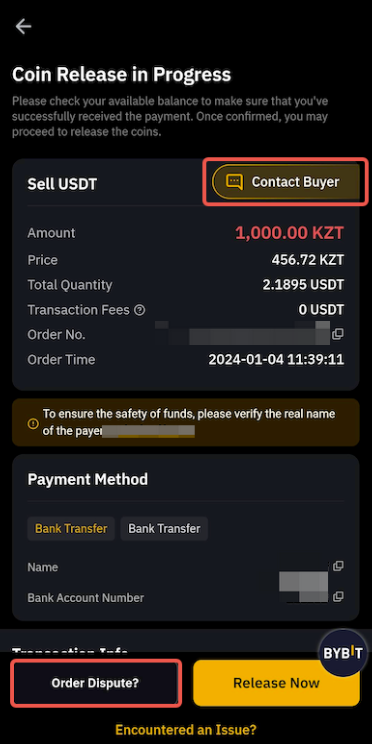 — Tên tài khoản ngân hàng của bạn phải phù hợp với tên đăng ký của bạn trên Bybit. Nếu không, tài khoản của bạn có thể bị tạm ngưng và bạn có thể gặp phải tổn thất tài sản vĩnh viễn vì người bán có quyền từ chối chuyển coin cho bạn.