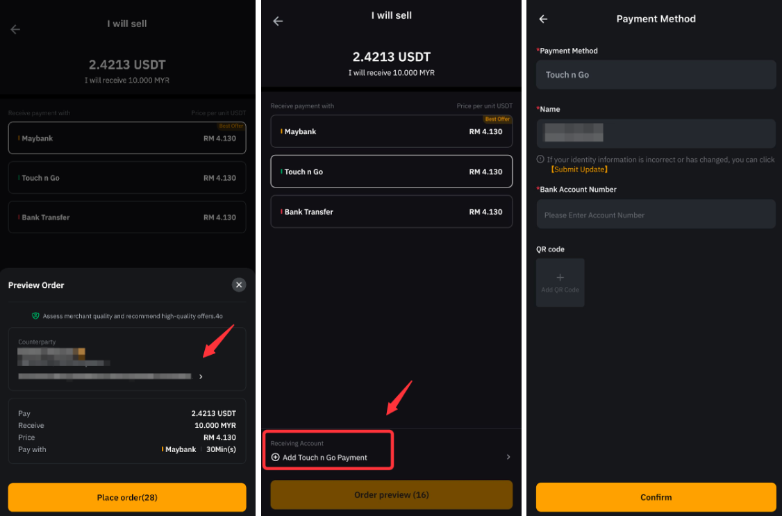 Bước 3: Chọn phương thức thanh toán bạn muốn sử dụng để nhận tiền fiat và bạn sẽ được chuyển đến trang Xem Trước Lệnh.