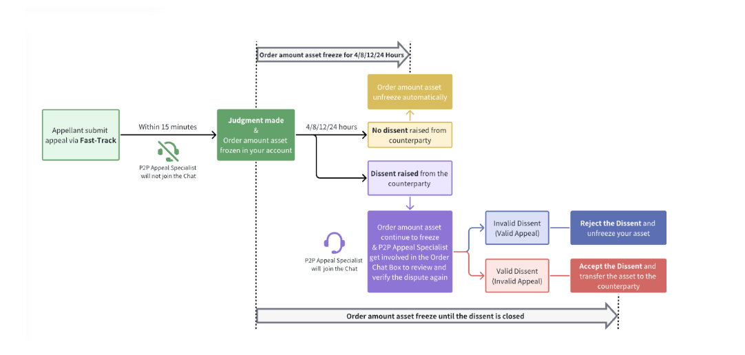 Khi gửi khiếu nại thông qua tùy chọn Fast-Track, sẽ có phán quyết trong vòng 15 phút và Chuyên Gia Khiếu Nại P2P sẽ không tham gia vào Hộp Trò Chuyện Lệnh. Sau khi hoàn thành đánh giá, số tiền lệnh sẽ tạm thời được khoá trong 4, 8, 12 hoặc 24 giờ để cho phép đối tác xác nhận kết quả. Thời gian đóng băng sẽ thay đổi tùy thuộc vào chiến lược. Vui lòng tham khảo giao diện để biết thời gian đóng băng cụ thể.
