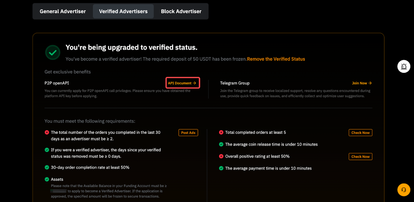 Bằng cách mở rộng quyền truy cập API, bạn sẽ có thể quản lý Quảng Cáo và Lệnh P2P của mình, tùy thuộc vào cài đặt Hiệu Suất API Key.