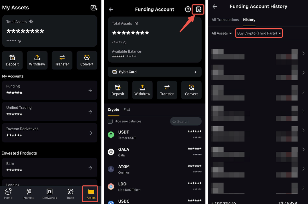 Trên Ứng dụng, vui lòng chuyển đến tab Tài sản → Tài khoản Funding, sau đó nhấp vào Biểu tượng lịch sử ở góc trên cùng bên phải, nhấn vào Lịch sử và chọn Mua Crypto (Bên thứ ba).