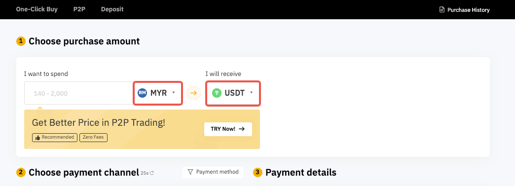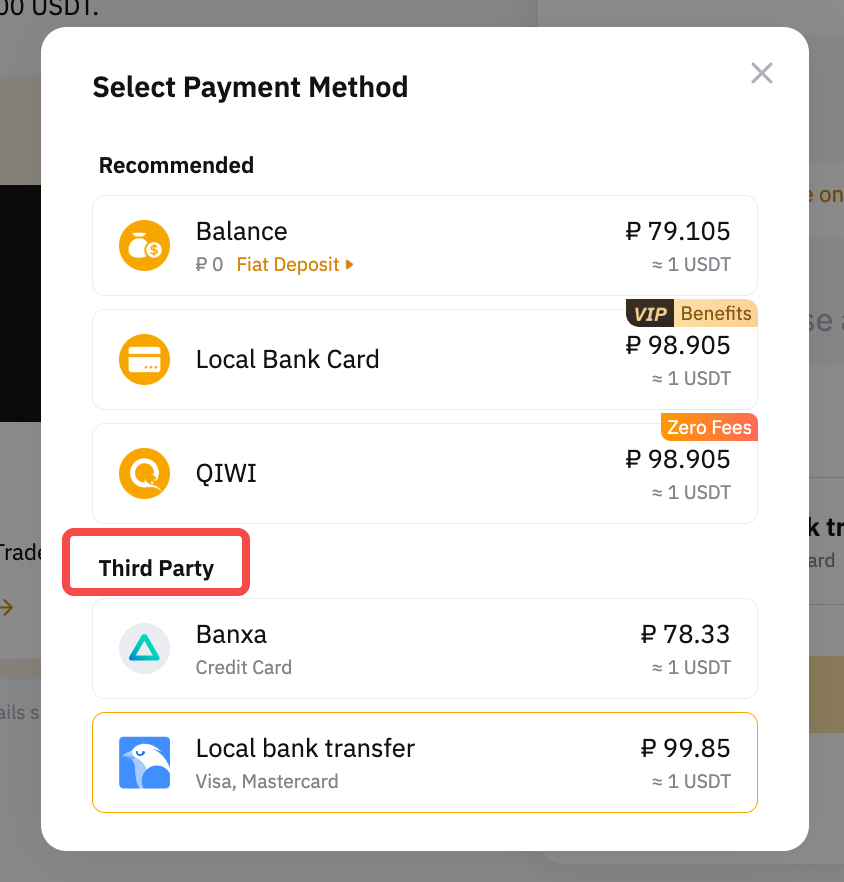 Bạn có thể tìm thấy danh sách các quyền chọn Fiat và tiền điện tử được hỗ trợ trên trang Mua One-Click và tìm thấy sự sẵn có của các phương thức thanh toán của bên thứ ba. Ngoài ra, bạn có thể truy cập trang lệnh của Bên Thứ Ba bằng cách nhấp vào danh sách thả xuống Fiat hoặc coin.