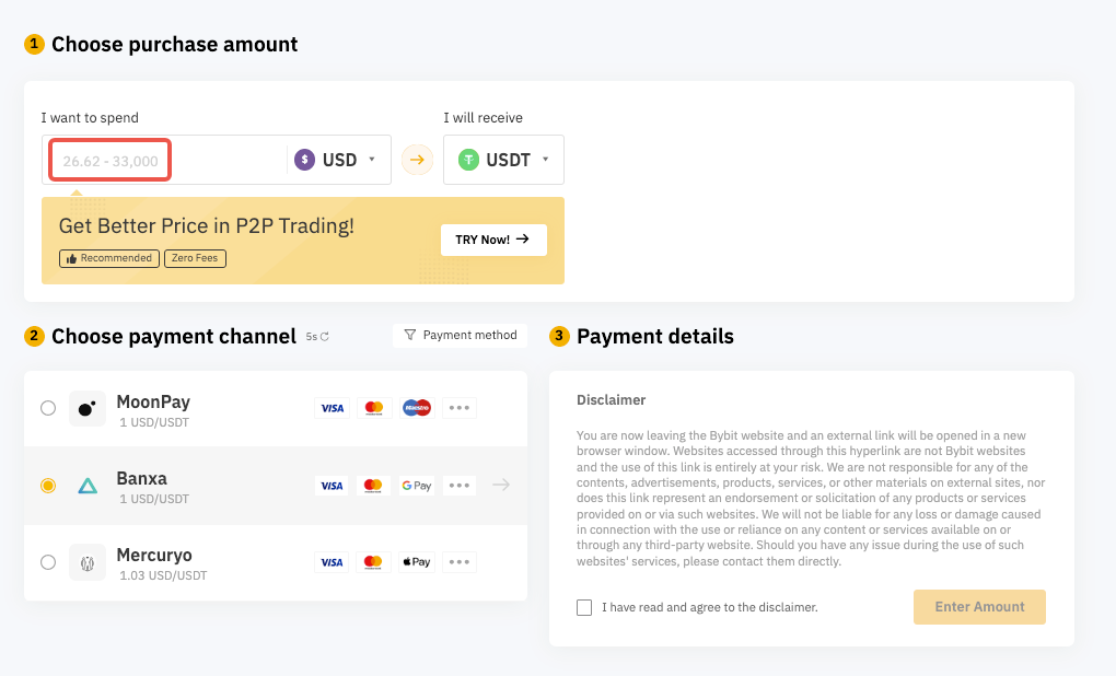 Có giới hạn số tiền tối thiểu/tối đa trên một giao dịch nếu tôi mua tiền điện tử sử dụng (các) nhà cung cấp dịch vụ bên thứ ba trên Bybit không?