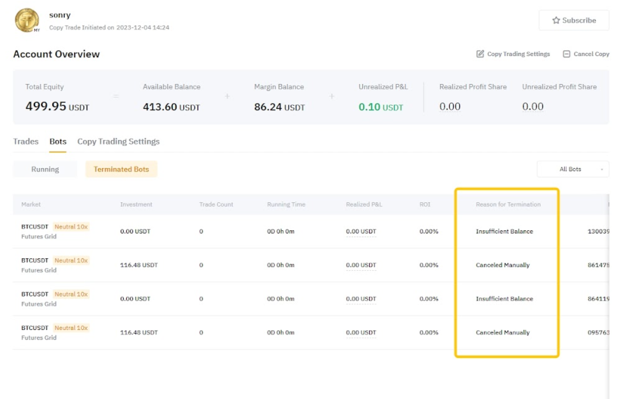 Người theo dõi không kích hoạt tính năng Sao chép Bot Hiện Tại. Do đó, các bot đã được Nhà Giao Dịch tạo trước khi người theo dõi bắt đầu sao chép Master Trader sẽ không được sao chép.