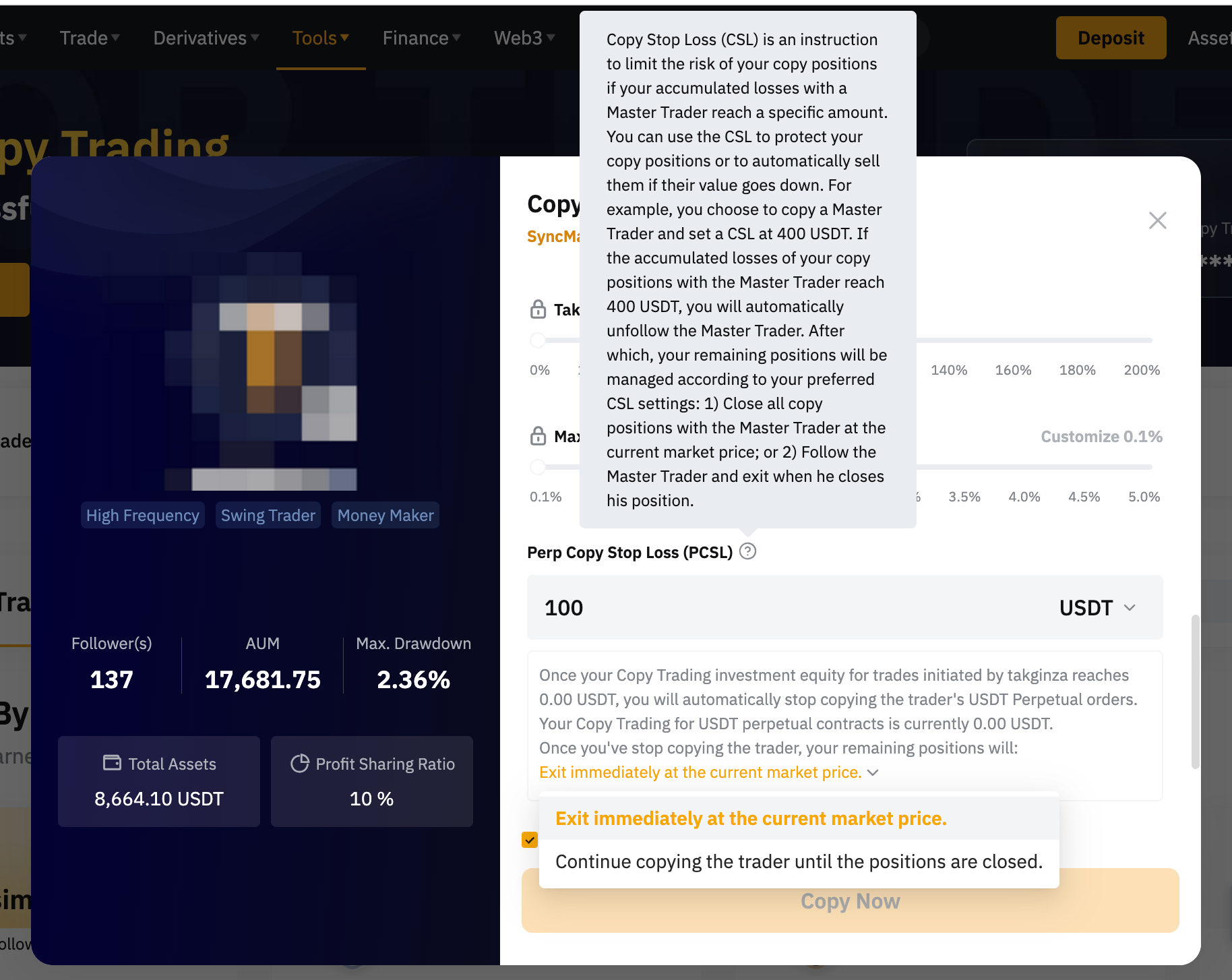 PCSL sẽ được kích hoạt khi Tổng Vốn Chủ Sở Hữu trong Sao Chép Giao Dịch của bạn được nêu trong Tổng Quan Tài KHoản của bạn với Nhà Giao Dịch Chính tương ứng đạt đến mức vốn chủ sở hữu dựa trên số tiền PCSL hoặc tỷ lệ phần trăm (%) đã đặt của bạn. Ví dụ: số tiền PCSL được đặt là 400 USDT, vốn chủ sở hữu hiện tại là 1.000 USDT. Khi vốn chủ sở hữu giảm xuống còn 600 USDT, PCSL được kích hoạt và tất cả các vị thế của bạn dưới quyền của Nhà Giao Dịch Chính tương ứng đó có thể thoát ngay lập tức với giá thị trường hiện tại hoặc tiếp tục sao chép Nhà Giao Dịch Chính cho đến khi đóng các vị thế, tùy thuộc vào lựa chọn của bạn. Khi bạn đã hủy sao chép Nhà Giao Dịch Chính, giá trị PCSL sẽ được đặt lại và tính toán lại nếu bạn theo dõi lại Nhà Giao Dịch Chính.