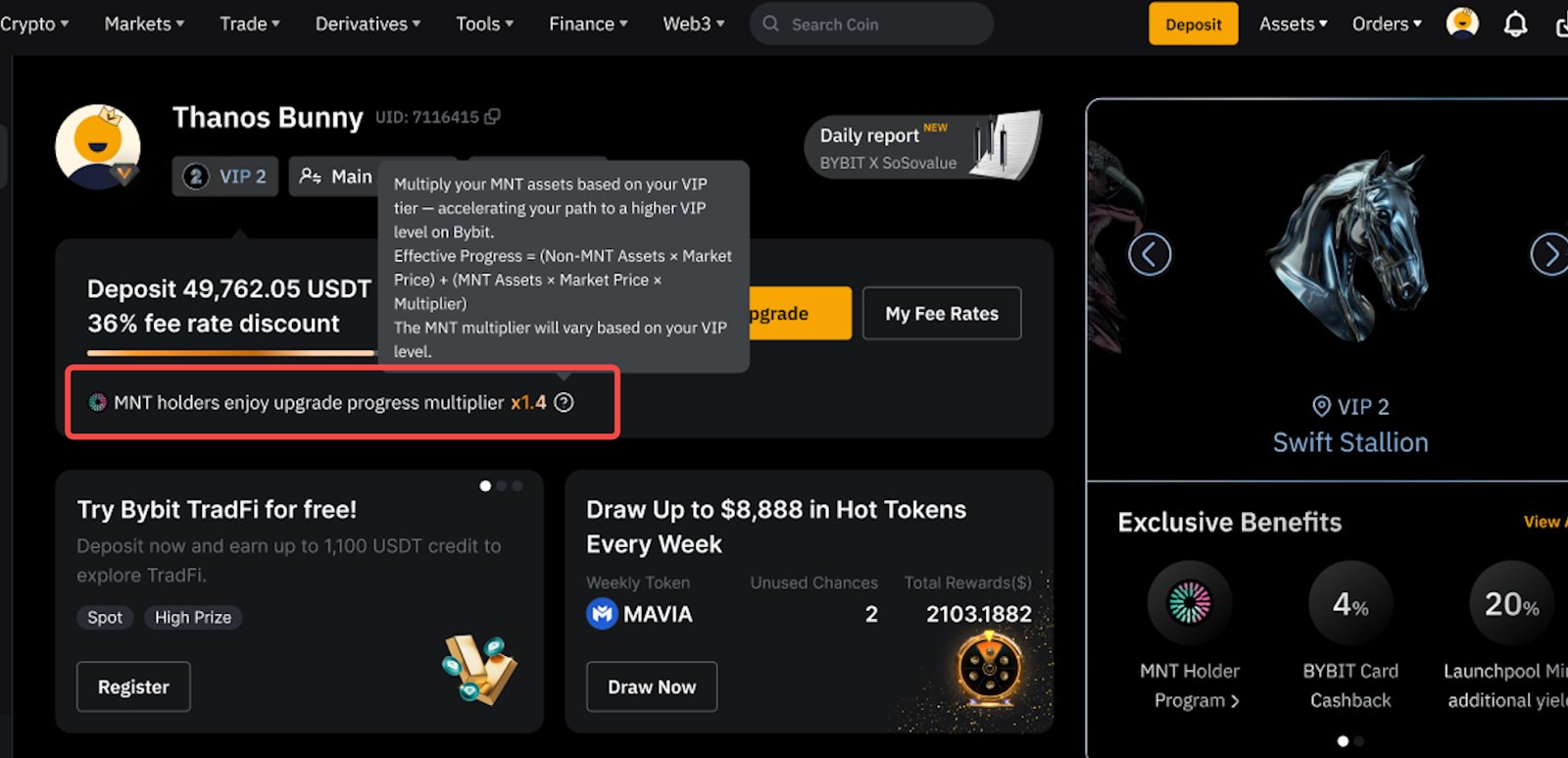 MNT 乘数对 MNT 持有者来说是一种好处,通过在资产价值计算中为 MNT 分配额外权重来加速 VIP 升级进展。根据您的 VIP 级别,您的 MNT 持有量将会计入您的总资产价值。有关详细信息,请参阅 MNT 计划简介。