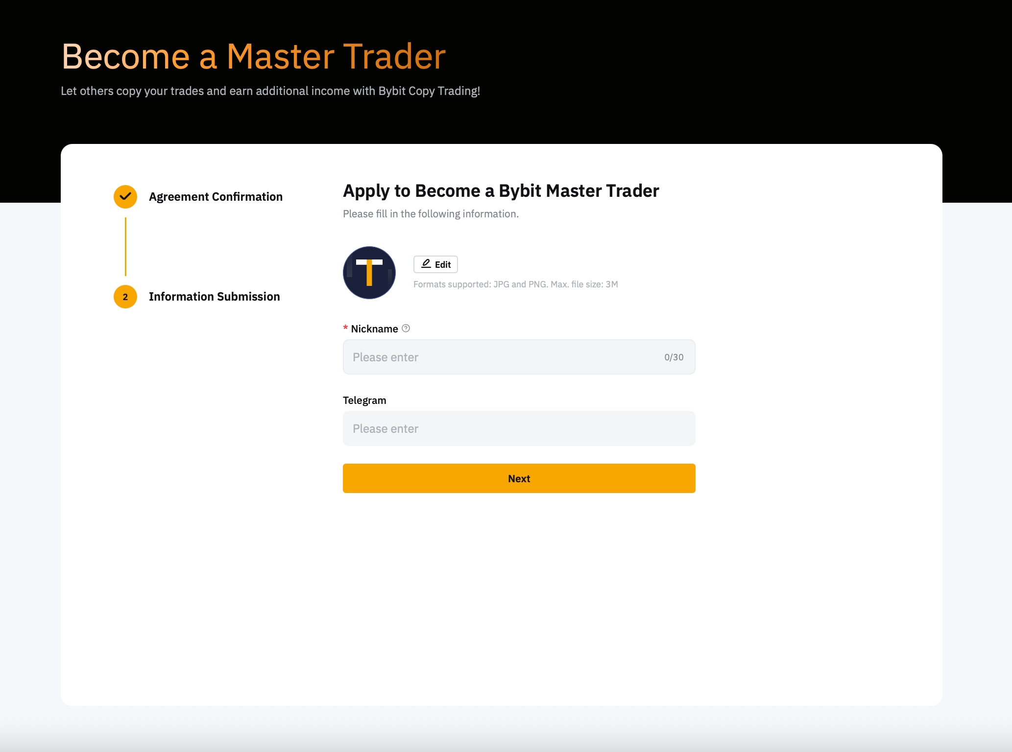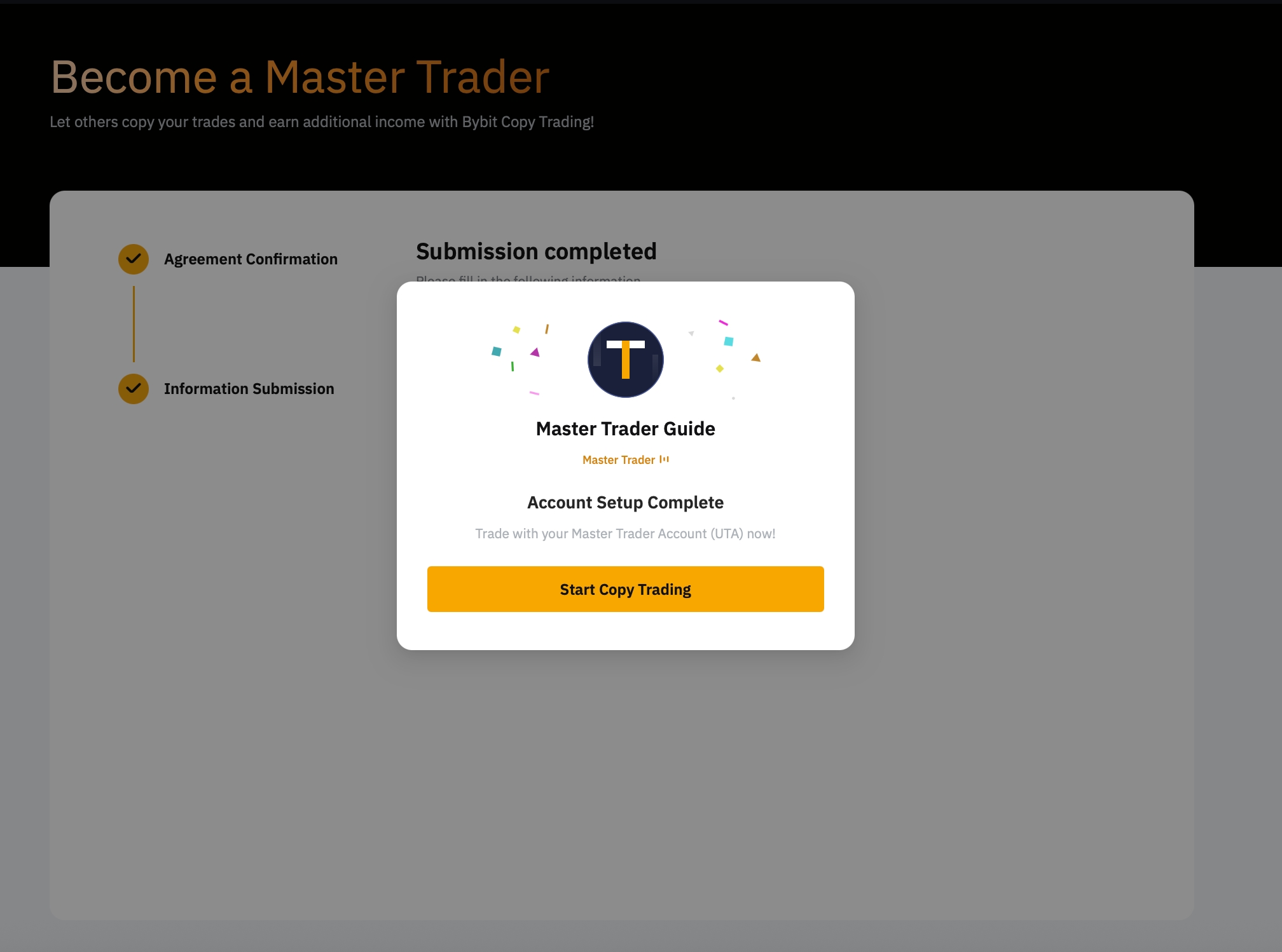 请注意,完成任务后,您的信息可能需要 2-3 个工作日才会显示在 Bybit 跟单交易推荐页面上。