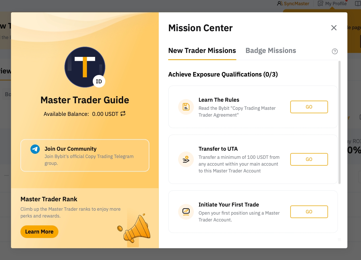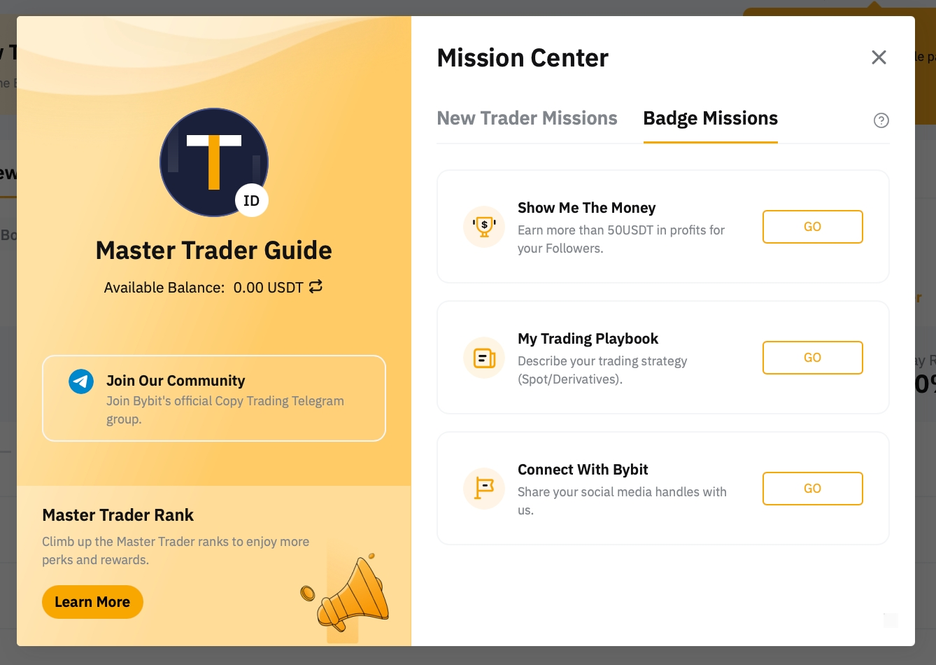 成功申请成为交易达人后,您需要完成任务中心里关于新交易达人的任务,完成后方可显示在 Bybit 跟单交易推荐页面上。