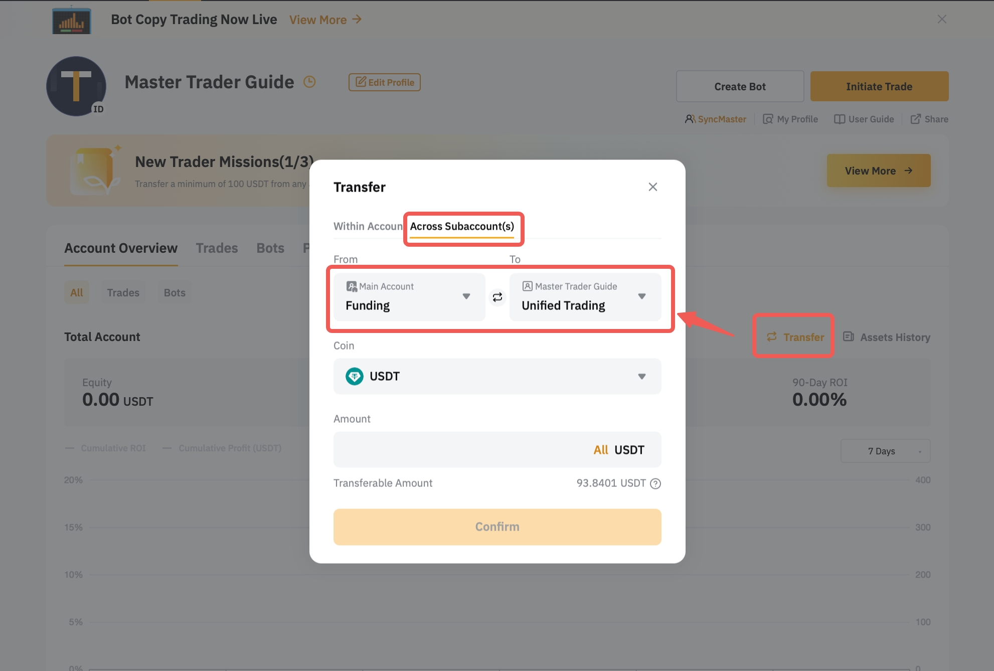 • 划转至交易达人帐户:从您主帐户内的任何帐户划转至少 100 USDT 至该交易达人帐户