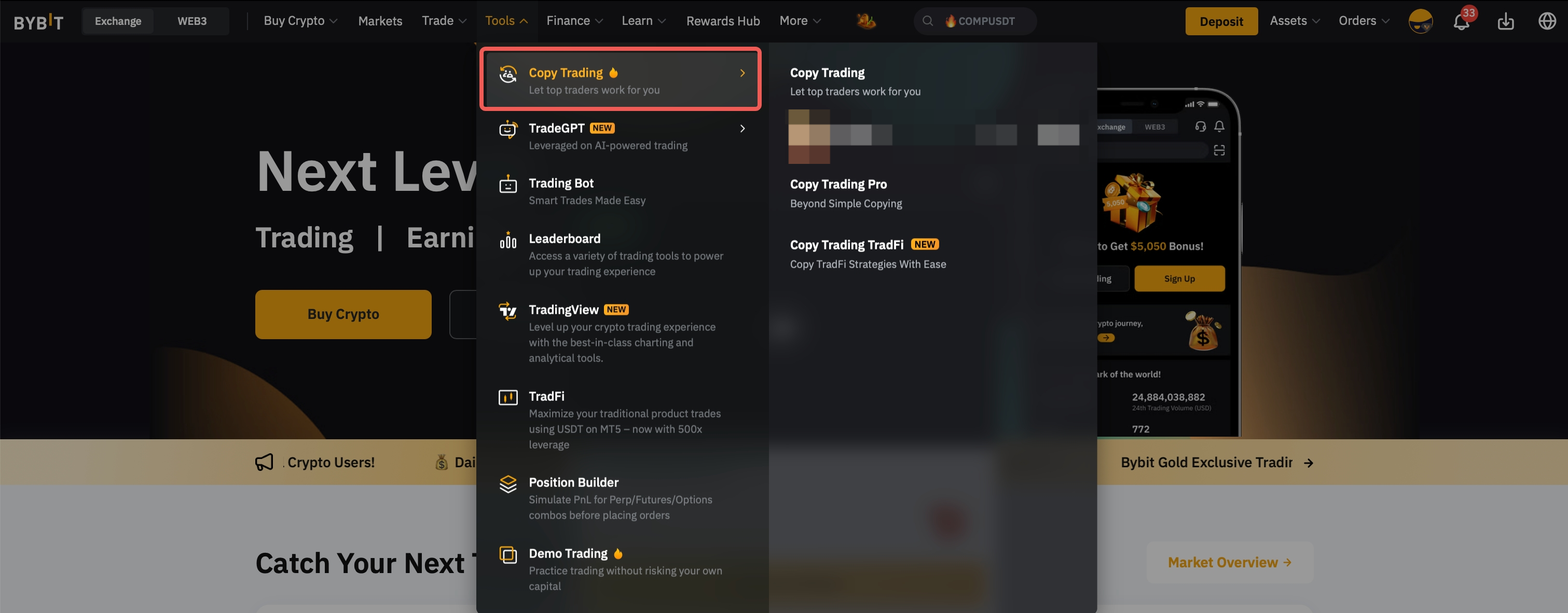 第 2 步:在导航栏中依次点击工具跟单交易,进入发现顶级交易达人页面。