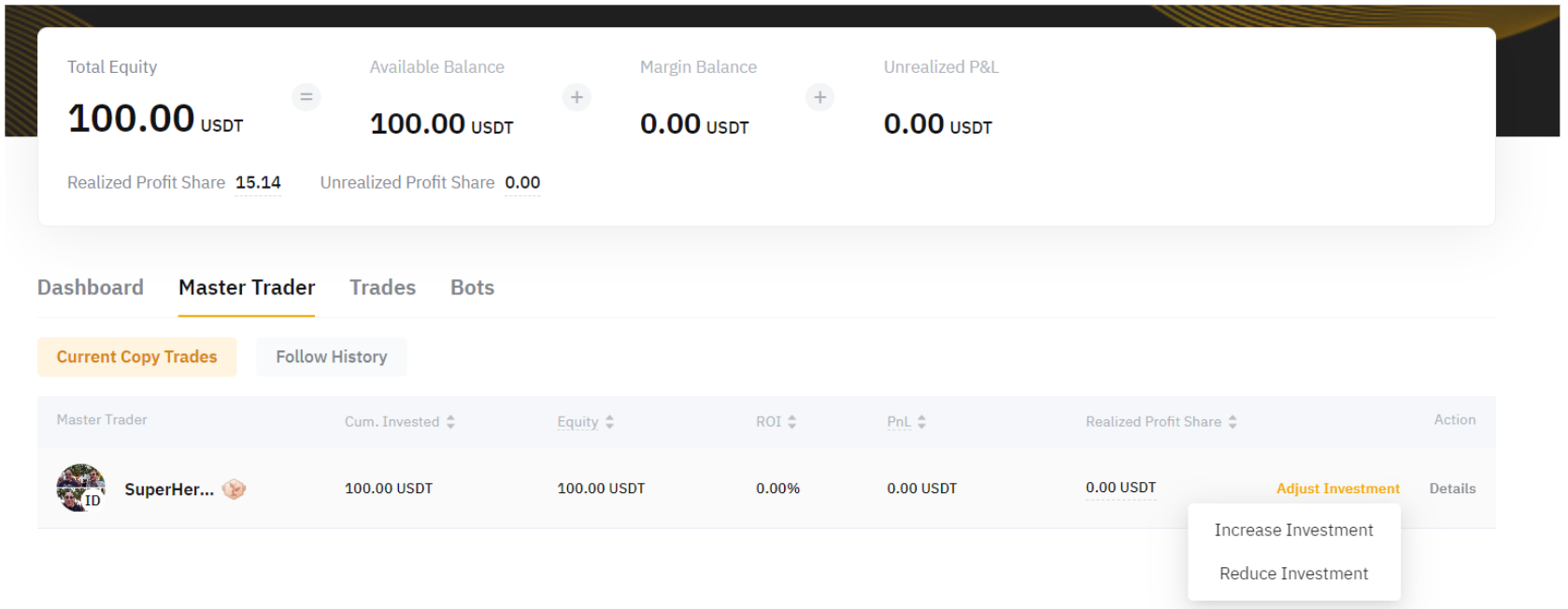 您可以查看不同交易达人的当前跟单交易跟单历史记录。 您也可以点击调整投资来增加或减少您的资金对相应交易达人进行跟单的本金调整。 请注意,减少的金额将自动转入您的资金账户。