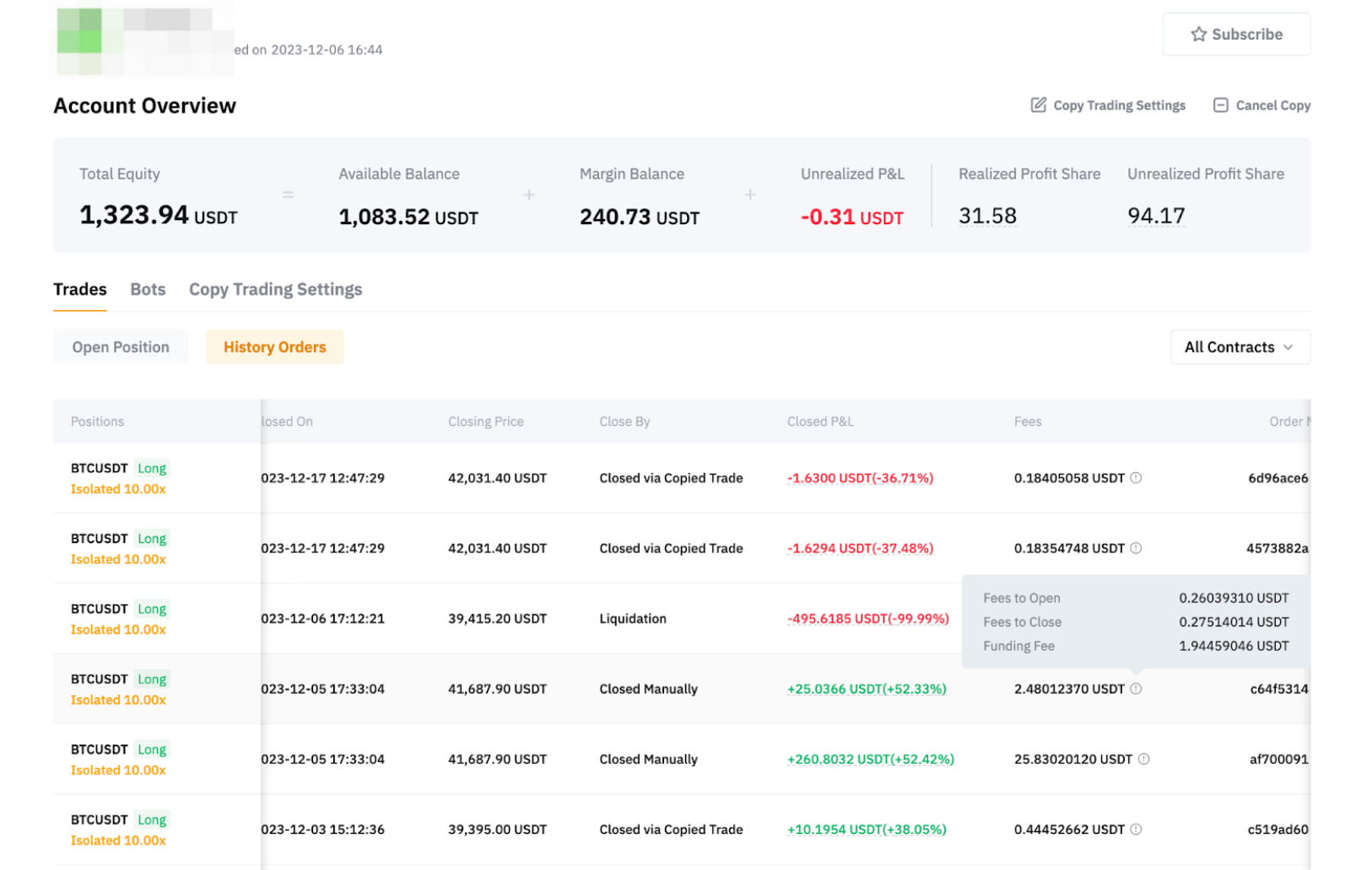 在跟单交易的跟单用户中心,用户可以查看自己的跟单交易账户概况、所跟单的交易达人当前或过去的交易表现以及订单详情。