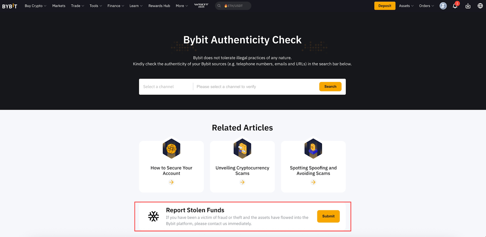 若您遭遇网络盗窃且被盗资金已被转移至 Bybit,您可以向平台举报并向安全团队申请协助您追索资产。