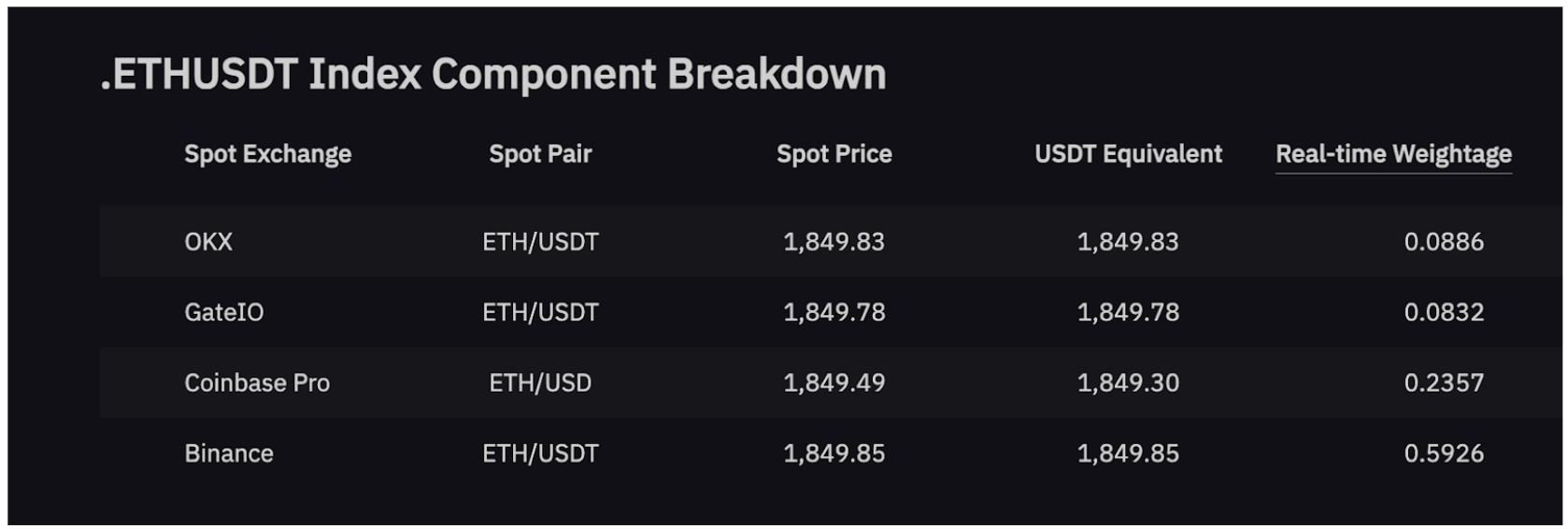 指数价格由 3 大变量决定:现货价格、USDT 交易对等值价格和实时权重。