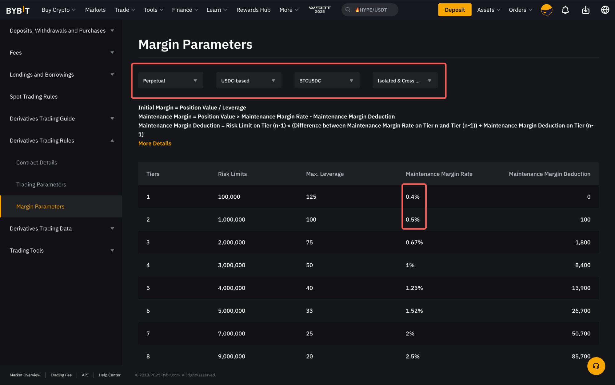 每個風險限額等級所需的 MMR 和維持保證金扣除金額可在保證金參數頁面輕鬆找到。