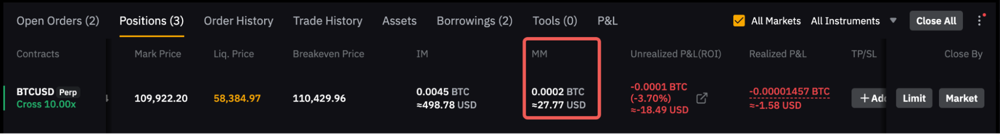 倉位所需的維持保證金 (MM) 可在倉位選項卡中找到。
